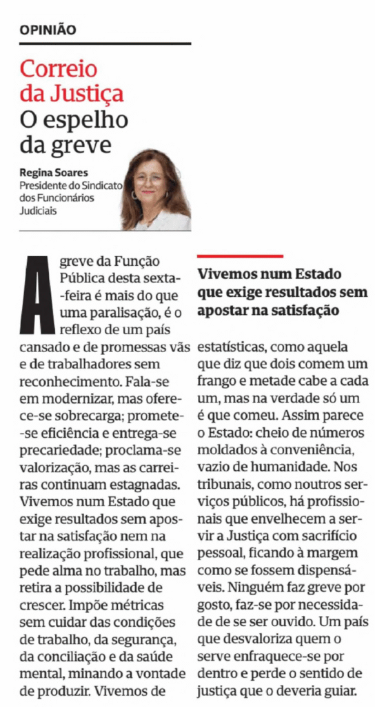 A greve da Função Pública desta sexta-feira é mais do que uma paralisação, é o reflexo de um país cansado e de promessas vãs e de trabalhadores sem reconhecimento. Fala-se em modernizar, mas oferece-se sobrecarga; promete-se eficiência e entrega-se precariedade; proclama-se valorização, mas as carreiras continuam estagnada s. Vivemos num Estado que exige resultados sem apostar na satisfação nem na realização profissional, que pede alma no trabalho, mas retira a possibilidade de crescer. Impõe métricas sem cuidar das condições de trabalho, da segurança, da conciliação e da saúde mental, minando a vontade de produzir. Vivemos de estatísticas, como aquela que diz que dois comem um frango e metade cabe a cada um, mas na verdade só um é que comeu. Assim parece o Estado: cheio de números moldados à conveniência, vazio de humanidade. Nos tribunais, como noutros serviços públicos, há profissionais que envelhecem a servir a Justiça com sacrifício pessoal, ficando à margem como se fossem dispensáveis. Ninguém faz greve por gosto, faz-se por necessidade de se ser ouvido. Um país que desvaloriza quem o serve enfraquece-se por dentro e perde o sentido de justiça que o deveria guiar.
