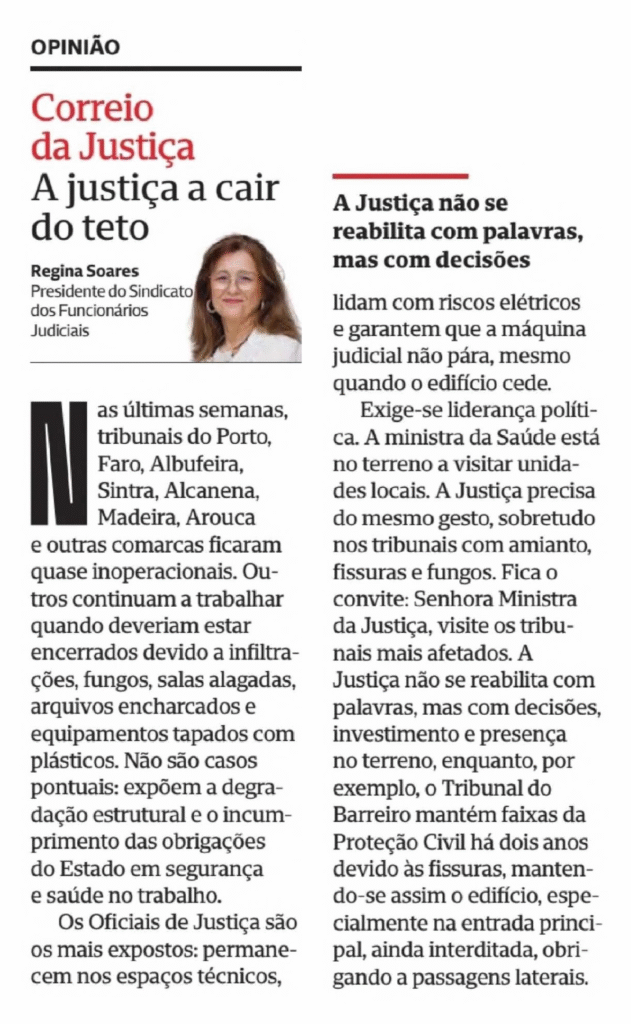 Nas últimas semanas, tribunais do Porto, Faro, Albufeira, Sintra, Alcanena, Madeira, Arouca e outras comarcas ficaram quase inoperacionais. Outros continuam a trabalhar quando deveriam estar encerrados devido a infiltrações, fungos, salas alagadas, arquivos encharcados e equipamentos tapados com plásticos. Não são casos pontuais: expõem a degradação estrutural e o incumprimento das obrigações do Estado em segurança e saúde no trabalho.